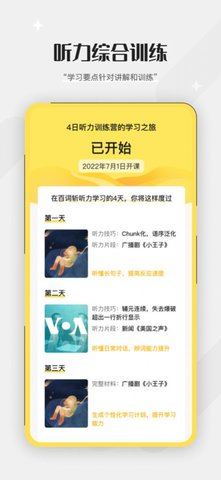 百词斩听力是一个便捷的在线管理平台。看到的学习课程内容仍然非常丰富,用户快速获取最新的学习信息,为了获得最全面的围棋知识,你可以每天在线练习,提高你的英语成绩,这个平台可以帮助你,为用户带来非常便捷的听力学习。快速的帮助用户掌握英语各方面的表达能力。