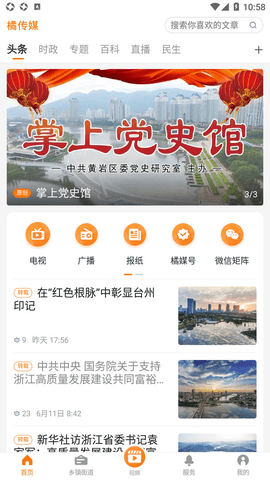 橘传媒app最新版,是为泰州市黄岩区量身打造的实用新闻资讯平台,该软件拥有丰富的新闻信息,新闻信息更新迅速,让用户及时了解最新的重大事件,该平台拥有各种新闻、电视直播等内容。