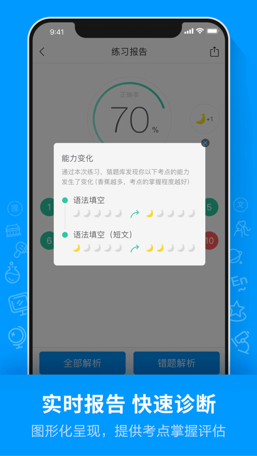 3、实时提供做题报告:分析弱项,查缺补漏,评估能力,预测考试分数。