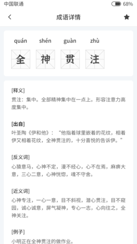 3、用户只要输入自己的查询内容,就可以搜索到详细分析的汉语成语,支持用户通过拼音或词根搜索