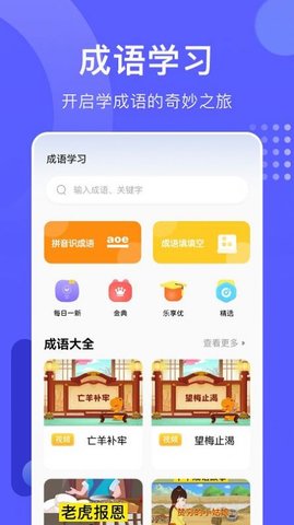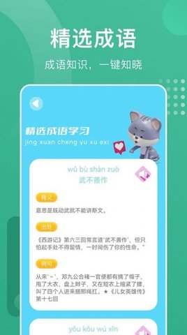 3、为了让用户更好的学习成语的应用,该软件拥有超完整的成语词汇和详细的内容分析,以及有趣的成语猜谜游戏,边玩边学