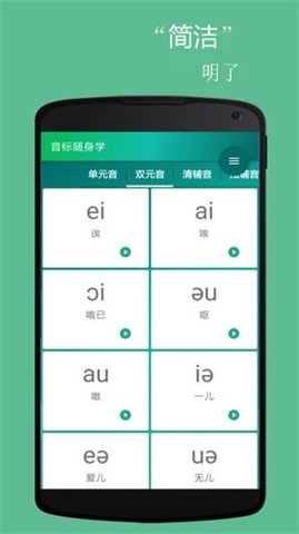 2、集合单位元音、清辅音、浊音,标准口型引导,真实美式发音,界面简单,操作简单,卡片式内容设计。
