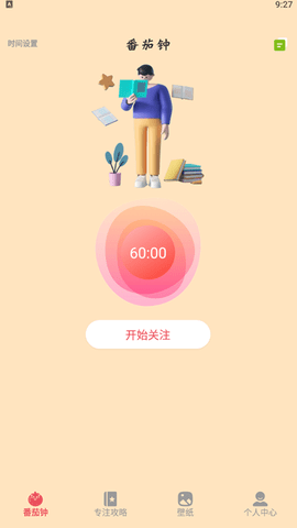 1、 番茄钟可以在任何时候一键打开。点击“开始关注”,就可以为大家提供倒计时服务,简单方便。