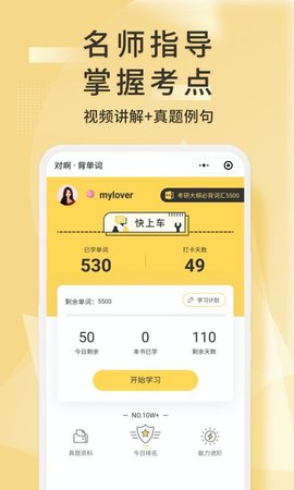 考研英语君这里涵盖的知识内容是很丰富的。在线提供更加丰富的教学视频,智能推荐减少你盲目学习的时间成本。可以根据您的实际情况制定学习计划,有自己的方法全部为你服务,满足你的一切考试需求。帮助用户更好地记住需要的单词知识,为用户提供考试准备计划。帮你可以快速通过考研英语考试。