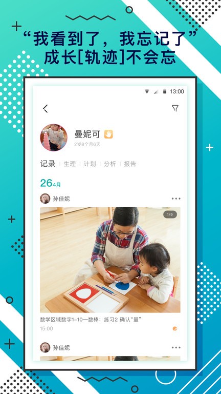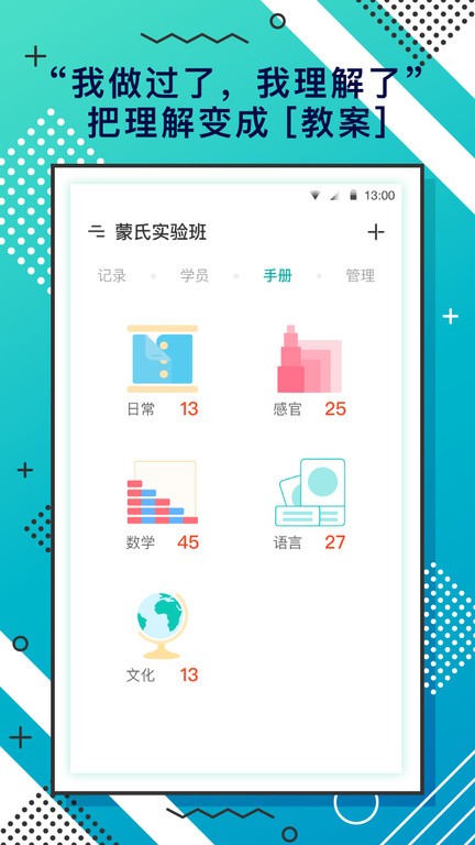 蒙氏手记是一款在线的教育管理软件。为用户提供了专业的教学管理模式。通过详细的记录整理方式,来了解学生们的实际学习情况,帮助学员把知识牢牢的记忆住,在线提升教师的工作效率。