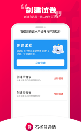 石榴普通话app让用户可以在平台上快速学习和提高,通过专注的学习和自己的努力,在考试中获得证书来证明自己的能力。石榴普通话有自由的学习模式,你可以根据自己的实际情况选择方向。