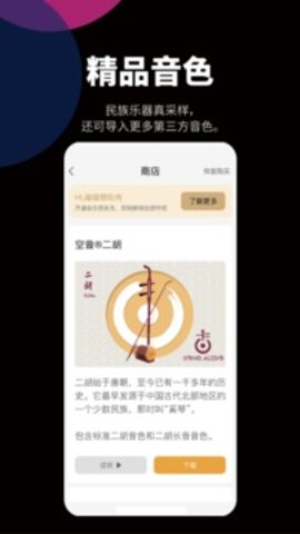 自乐班APP预装了多个具有微调功能的高品质音源,从一个包含138种乐器的综合乐器包到七种音色卓越的中国民族乐器包,这是你方便的音乐武器。