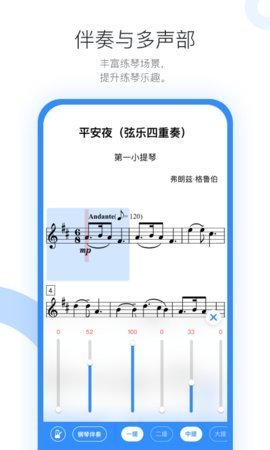5.一起练琴app还提供大量电子乐谱,其中大部分提供伴奏或合奏,同时支持播放、任意切换多个部分和自由调整速度。