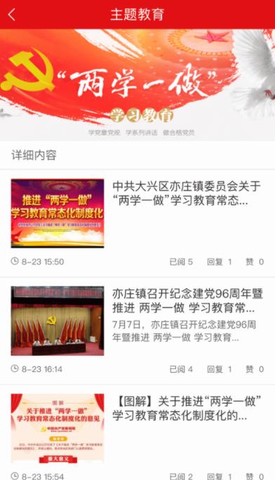亦党建app手机版的最新版本是北京市大兴区亦庄镇人民政府推出的一款手机党建学习软件,软件中具有大量党建学习资源。能够随时随地在线学习,还会有主题学习、视频音频、答题测试等版块。