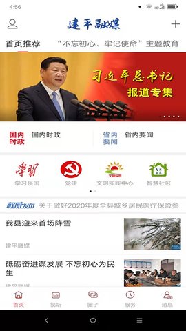 2、设置多种首页信息展现区域,其中有国内、省内时势,以及学习强国、党建、文化理论中心等区域。