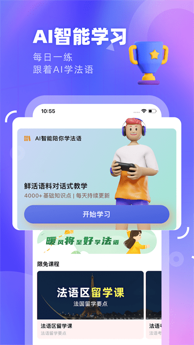 2、基于海量数据的云端词典,都可使用个人帐号无缝学习,能随时学习专业的法语。