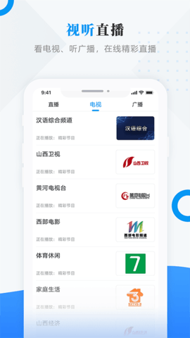 4、视听直播:看电视、听播送、网络直播。