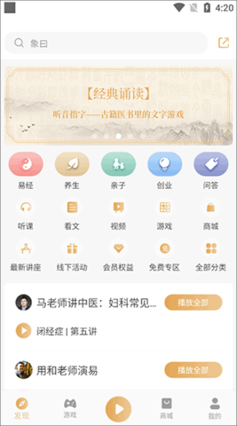 1、课程分为五类:易经大道,由教育家庭、早期易经教育从业者、教员讲授,中医养生,从269年御医秘方到保定著名中医教员马建明讲学