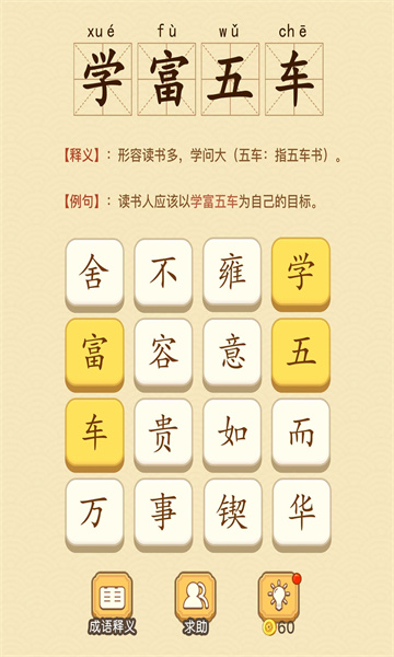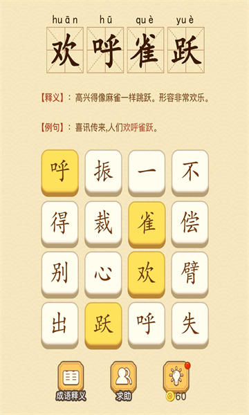 2、在闲暇的时间就能学习中国流传的四字成语,轻松的通过所有的关卡挑战。