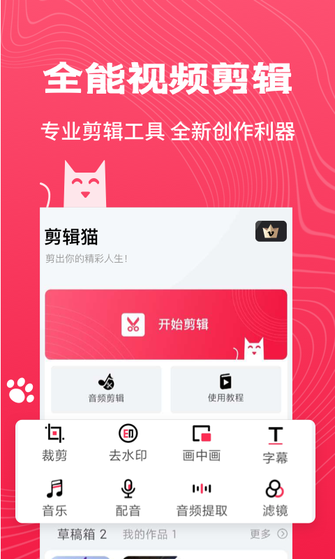 剪辑猫app是一款非常好用的手机视频制作剪辑软件,软件功能强大,这款视频制作app十分适合喜欢拍视频的小伙伴使用,拥有的功能众多,不仅仅可以进行视频剪辑,还可以编辑为你的视频加上炫酷的特效,分分钟成为爆款轻松上热门,是你的视频剪辑好帮手,剪辑猫手机版下载之后海量精美模板可以使用,还有超多滤镜,让你的视频更有格调,你只需要发挥你的想象力,一定可以做到你想要的效果,有需要的用户欢迎来yn下载站下载使用。