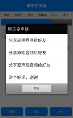 聊天变声器,是一款可以支持微信变声以及各种声音效果变化的全能变声器APP,软件内包含女生、男生、老人、机器人等多种声音效果,并可以通过QQ、邮件等方式将变声后的音频共享给好友,更重要的是它支持通过微信语音发送变声后的声音。