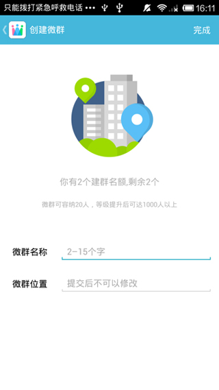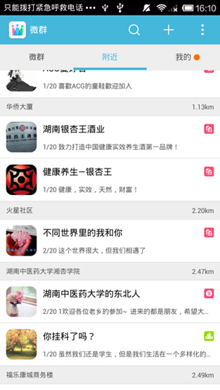 跟微信2019最新版本同样简洁的界面风格,qq和微信两种登陆方式,定位于找到身边兴趣相投的朋友,有创建微群、搜索微群、碰一碰等功能。除了邀请好友还可从qq和微信上接入好友,也可碰一碰找好友,微群创建成功后可对附近的人可见,最大的亮点是微群组的人数可无上限,人数越多对应的被搜范围就越大从5KM起到同城范围。群分6个等级,最高级为认证,人数无限,搜索范围同城。这款类似qq群的应用,是定位于陌生人或半熟人社交。
