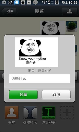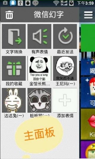 现在已收录表情有"黄小脸"--恶搞QQ经典表情、"金馆长熊猫表情"--是使用暴走漫画制作器制作而成的,相信你一定会喜欢、"王尼玛"、"冷兔"等几十套表情,以后会不定期添加新的表情,请留意微信幻字的表情库!