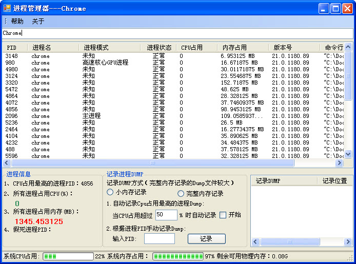进程管理器支持记录进程转储。如果发现某个进程的CPU占用率过高,它可以向进程管理器记录转储信息,然后将其反馈给主持人进行分析。