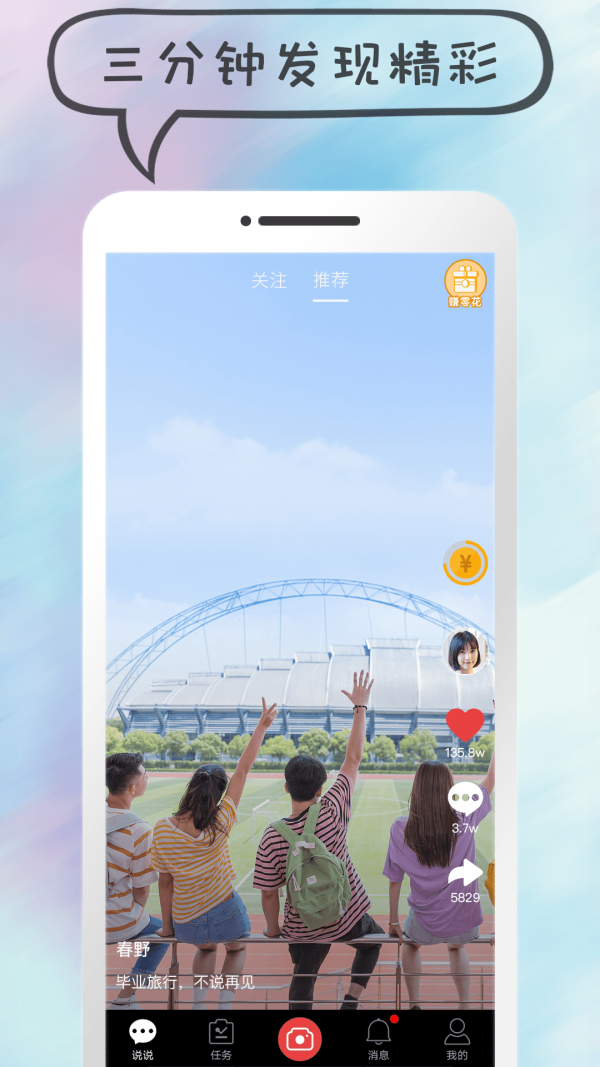 这是一款大家非常喜欢的短视频分享聊天社交应用软件,说说短视频app下载之后你可以通过录制短视频,一键分享到社交平台,让大家发现有趣的你,说说短视频邀请码生成之后可以发送邀请码给你的朋友,一起做任务看视频,能提现吗?大家做到一定任务量,都可以进行提现,欢迎喜欢的用户来yn下载站下载使用,更多视频录制app等您体验。
