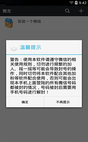 使用本软件请遵守微信的相关使用规则,切勿进行频繁的加人、摇一摇等可能会导致封号的操作,同时切勿将本软件配合其它加粉等软件配合使用,否则可能会出现本手机上登录的所有微信号码都被封的情况,号码被封后需要用手机号码进行解封!