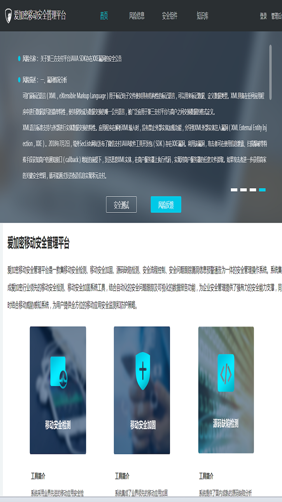 1. 系统集成爱加密行业领先的移动安全检测、移动安全加固系统工具,结合自动化的安全问题跟踪及可视化的数据报告功能;