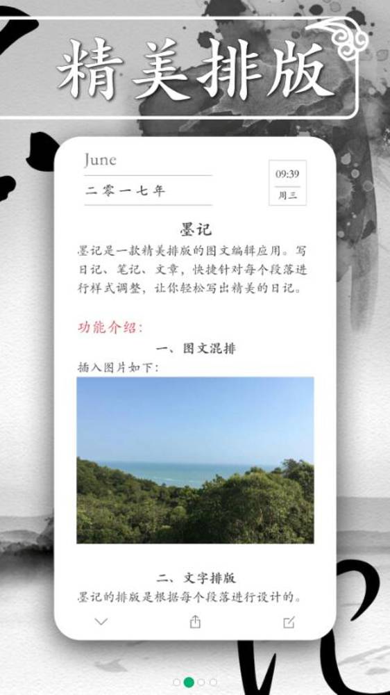 墨记日记是一款水墨画风的简约的日记app。界面简约,黑白的水墨配色让用户眼前一亮,使用手感舒适。墨记使用简单,功能强大,采用采用独特的加密方式,保证日记仅用户自己可见。储存在云端,无需联网,即可自由修改记录日记。