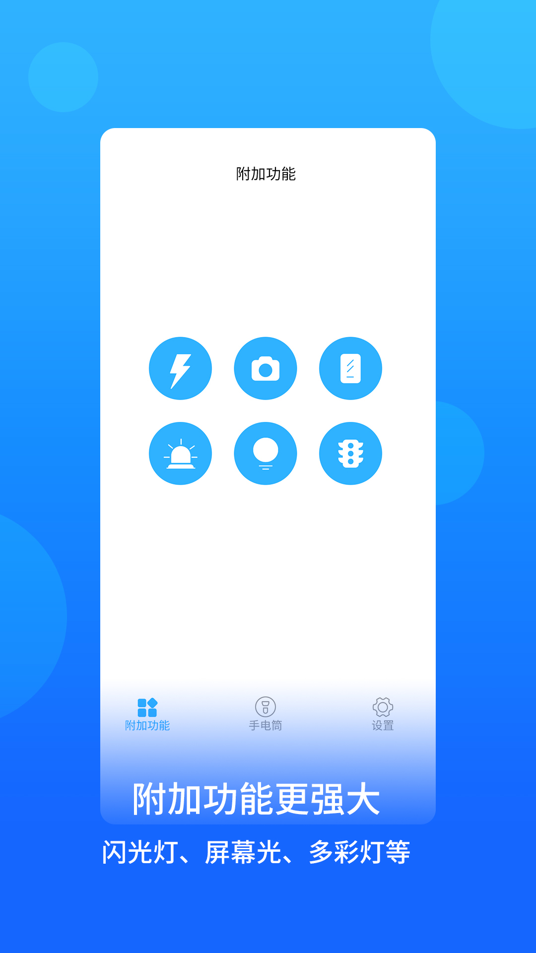 蓝光手电筒软件是一款多功能的手电筒软件,帮助用户在黑暗的环境之中照明,比手机自带的手电筒更加明亮,并且用户可以自行调节手电筒的亮光强度,非常智能,蓝光手电筒下载后除了照明以外,还拥有闪光灯、屏幕光、多彩灯等等附加的功能,这些功能可以帮助用户更好的利用手电筒。