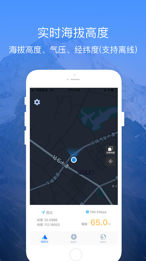3、GPS定位:Gps海拔仪下载后GPS实时定位用户,让测高信息更快更准确。