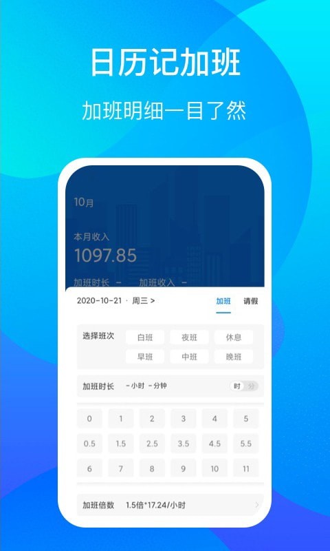 好记加班安卓版是一款非常实用的加班记录软件,可以在软件上设置自己一个月和一个小时工资分别都是多少,软件会按照你设定的工资计算加班费,一键即可记录加班,时间精确到每分钟,加班明细一目了然,帮助用户更加轻松便捷地记录上班时间和工资情况。