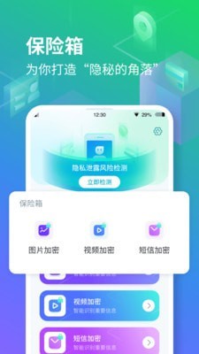 隐空间安卓版是一款功能强大的隐私保护类软件,可以帮助用户一键检测手机中隐藏的风险和容易泄露隐私的地方,用户可以对它们进行管理,让自己的手机更加安全,此外,隐空间app下载后用户可以使用它来给自己的相册、视频和短信来进行加密,避免别人拿到手机后看到重要信息。