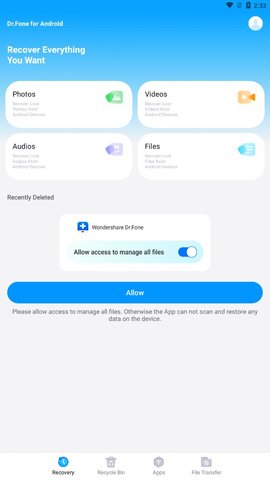 Dr.Fone数据恢复软件是一个非常好的数据恢复软件,这是一款为移动设备设计的数据恢复工具,官方版的Wondershare Dr.Fone帮助您恢复丢失的文件,包括视频,意外删除、无法恢复、留言等功能。