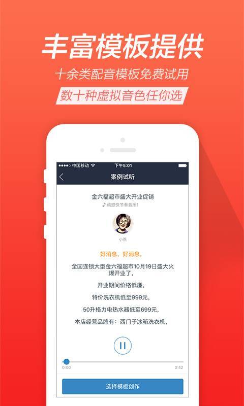 3.大量的示例声音模板文案,高质量的背景声音库,完美匹配。