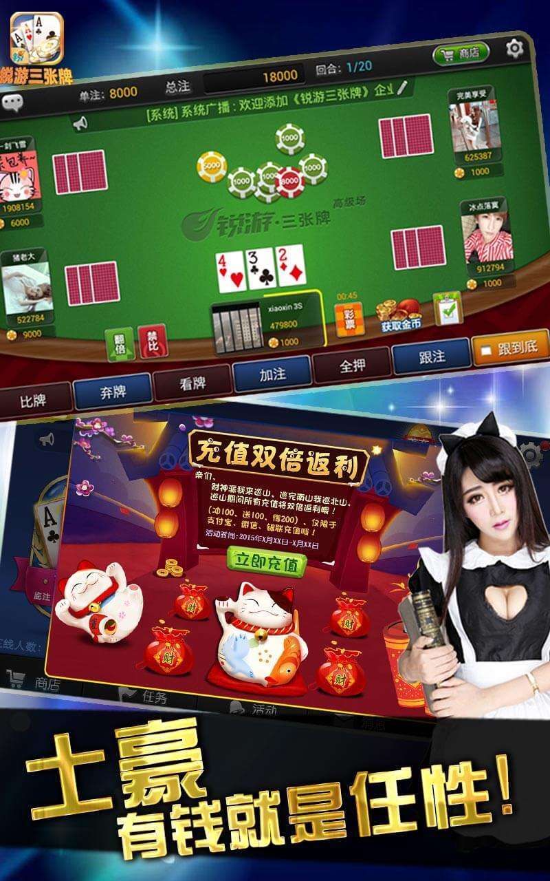 锐游三张牌随时都可以去邀请好友们一起来玩的真人活动,为你带来不一样的游戏挑战和精彩哦,组局竞技,很过瘾的,超过的活动你都可以来参与。快来试试这款锐游三张牌吧!,是yn下载最新推荐的安卓游戏。