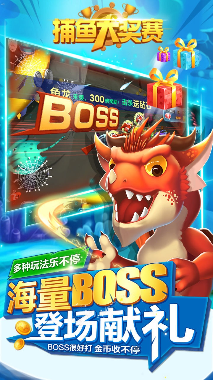你可以在游戏中使用鱼炮来捕捉各种不同的鱼类,还有各种顶级多金鱼王boss,官方还有各种赛事来让你领取各种超值奖品。