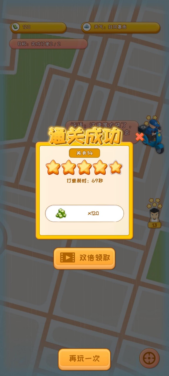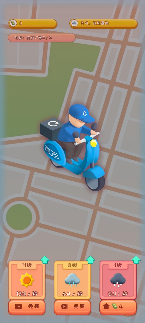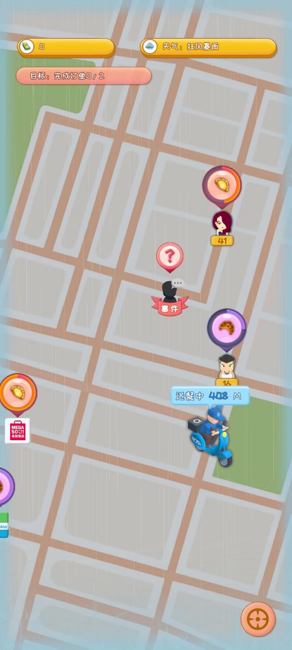 不同的天气及场景会影响送餐的速度,天气晴朗时,送餐速度为正常;当遇到雨雪天气,则会降低行驶速度,保证安全驾驶。外卖小哥在送餐途中还会遇到各种突发事件,考验临场反应能力。