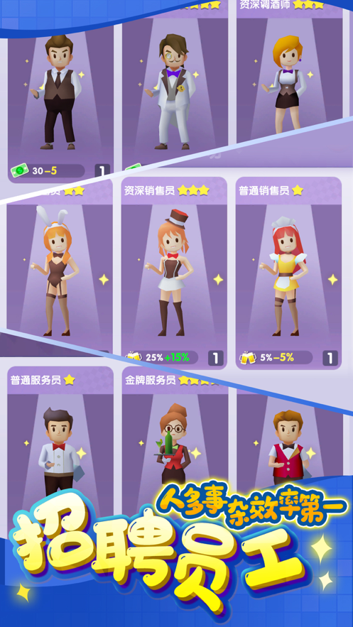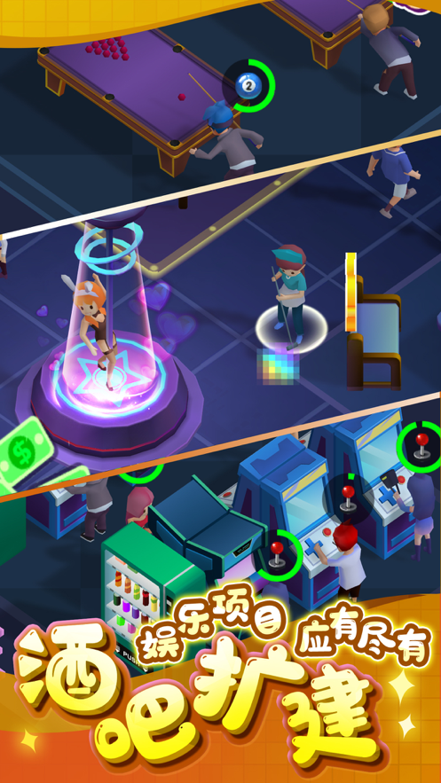 老板喝一杯游戏是一款休闲放置类模拟经营游戏,玩家在游戏中扮演一个俱乐部老板的角色,不断给俱乐部增加各种各样的设施以获得更多利润,调酒品酒,舞池蹦迪,飞镖桌球保龄球应有尽有,全方位为顾客缓解一天的疲劳。