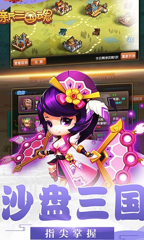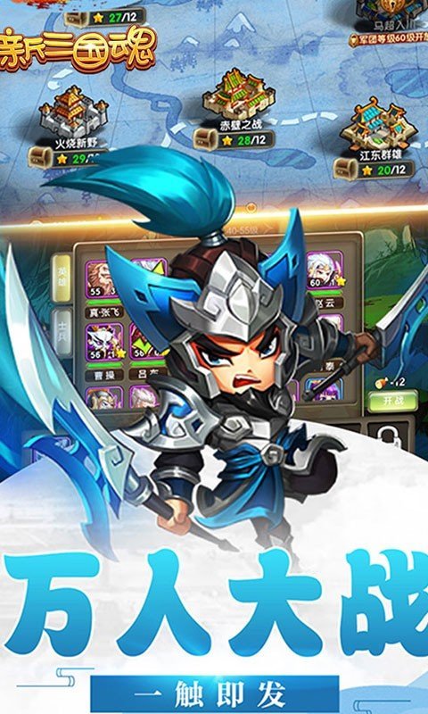 三国题材Q萌风格的战斗冒险RPG手游。游戏采用了放置式RPG+创新非回合对战玩法。全新技能特效别具一格,让你爽快征服时代,打造属于你的历史!顶级画质,华丽的技能特效和打击感,让你欲罢不能!强力的野外BOSS,炫酷翅膀,丰富的PVP&PVE玩法,极速飙升战力,让你成为热血沙场上的王者!