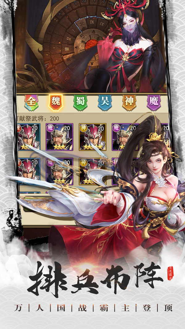 首先进入放置三国破解版游戏会有新手指导,当你完成新手任务就会进入游戏抽卡环节。既然是三国类手游自然讲究武将阵营。刚开始第一抽的武将都是固定的,拿完这个固定武将继续完成主线任务。当你达到5级以后就可以进行十连抽武将,这个游戏初始非常容易刷,大概一个只需要5分钟时间。这里我建议刷个魔关羽开局,因为前期最强的武将就是魔化关羽。比起其他武将后,魔化后的都是非常强力,这就是传说中的黑化强三分,洗白弱一半的设定吧。