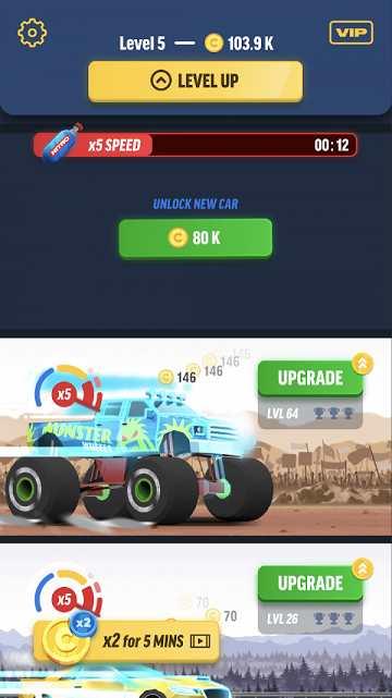 2、不断的点击合成更高级的赛车就能赚钱。