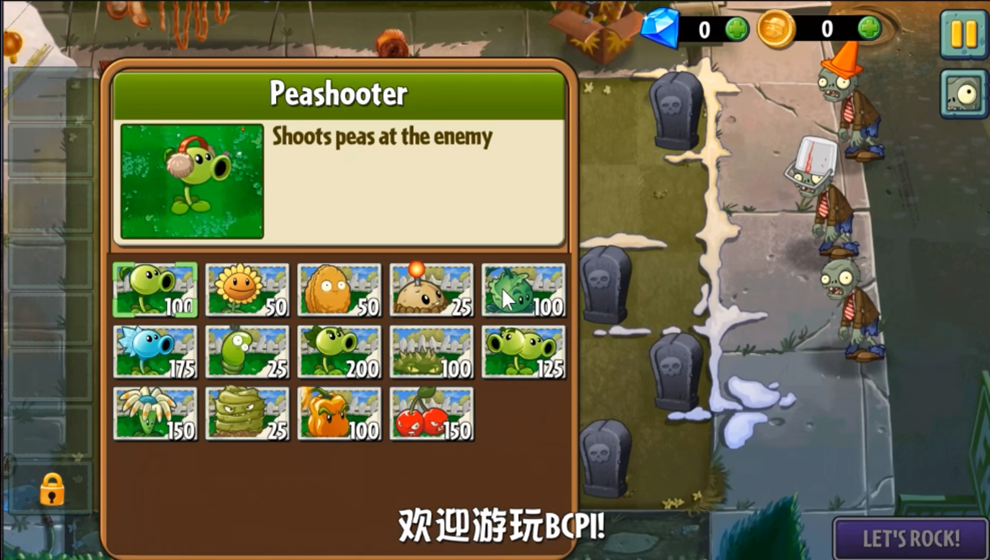 游戏共有26种不同的僵尸敌人,包括开着车子的雪橇车僵尸和投石车僵尸等。49种功能互不相同的植物,并可收集硬币购买蜗牛等多种道具。打开图鉴,就可以看到植物与僵尸的详细介绍。