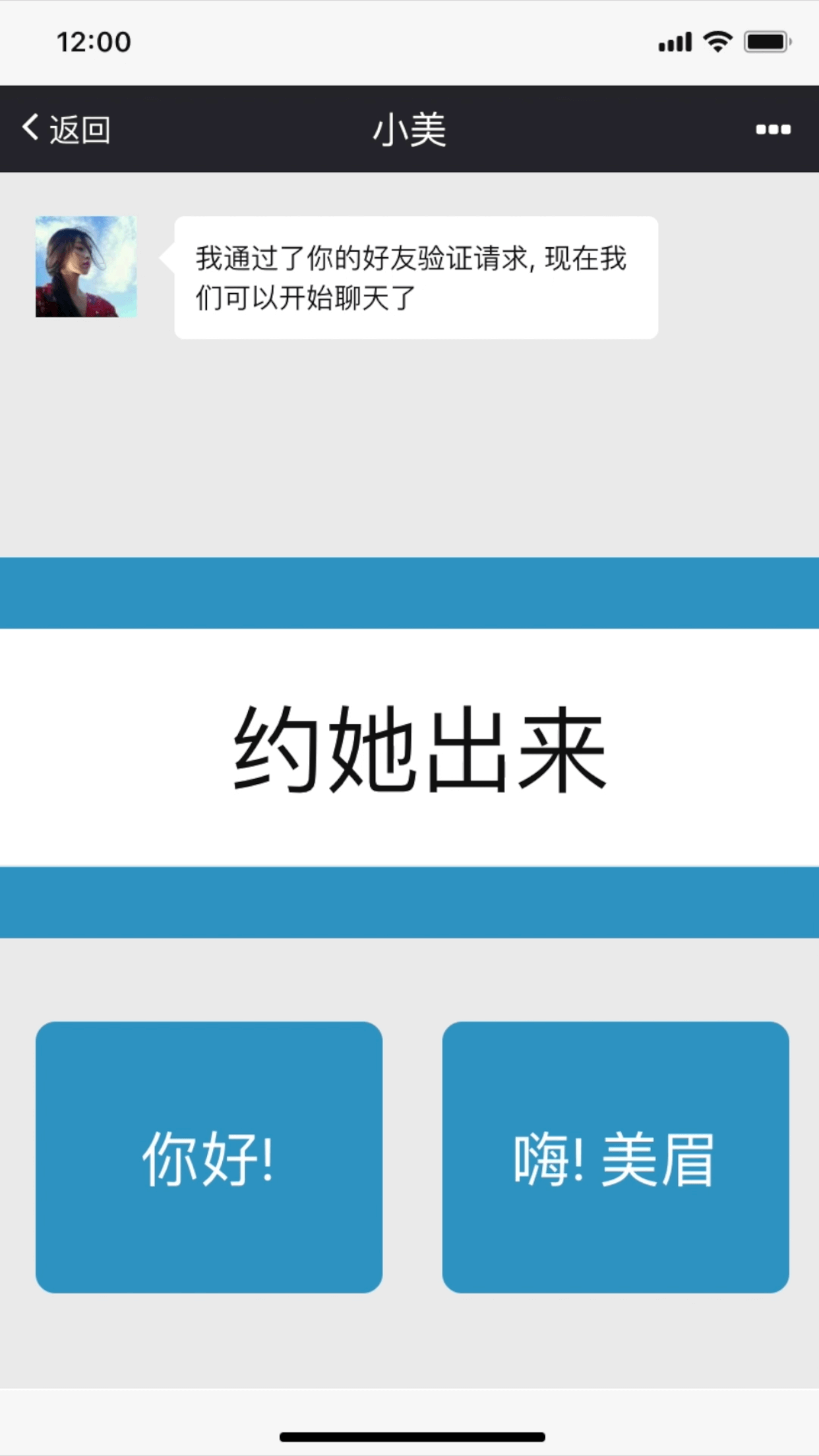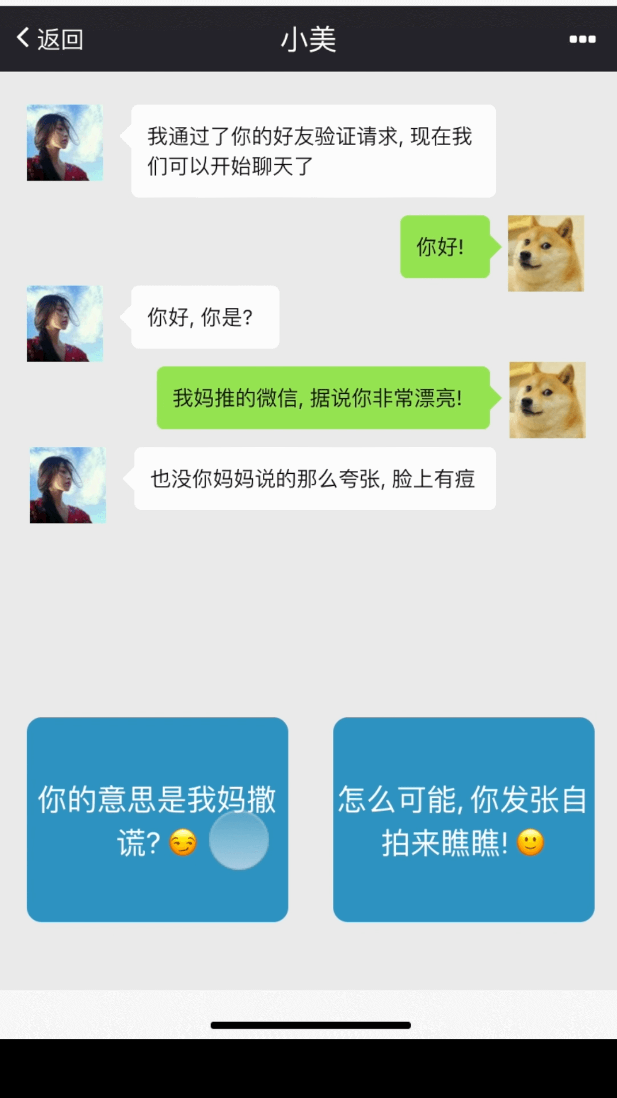 4、从加上小姐姐的微信开始模拟,每一句对话都由玩家来选择,有一个隐藏的评价标准,如果合格就可以进入下一关,最终追到女神。