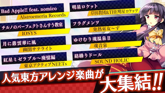 东方弹幕神乐日版是一款以东方project为主题的同人音乐节奏游戏。在这个游戏中玩家听到非常多的东方projetc的相关歌曲,并且能够看到漫画中的主要角色,原汁原味非常经典。游戏主打音乐节奏游戏,玩家根据音乐节奏来按键操作,成功的话就能够获得非常多的分数奖励了。每一首音乐都有不同的难度,看看玩家能否顺利完成专家难度的挑战。喜欢的朋友一定要来下载体验哦!