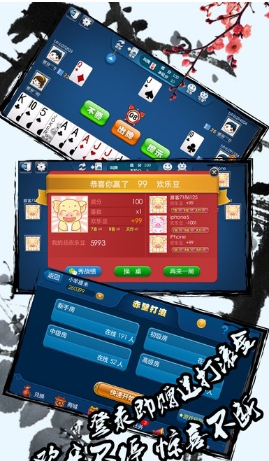 1.一款4人2对扑克游戏,融合了多种风格,如争夺上游、找朋友、斗地主和5K。