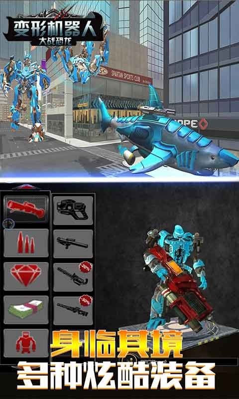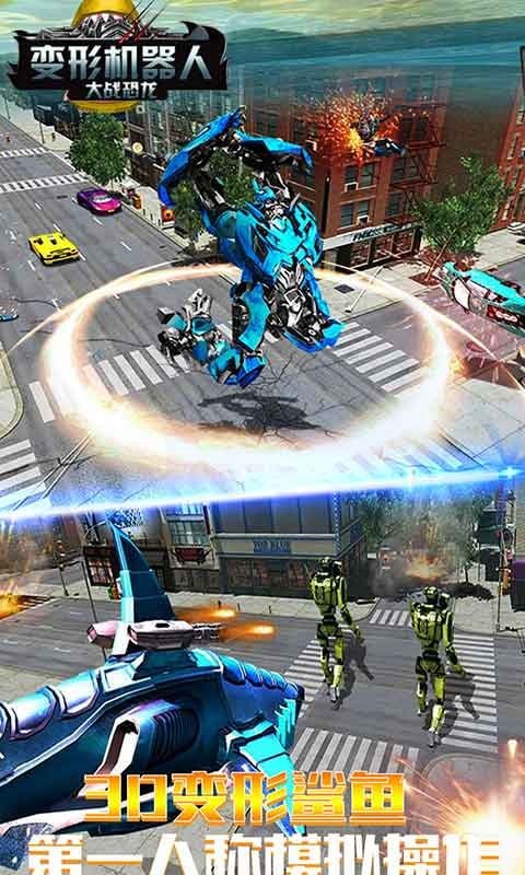 2、是拥有庞大世界观的3D游戏,精彩异常。机器人可变化为3D真实鲨鱼,在水中自由潜行,也可以变成人形,在模拟真实城市中自由行走。