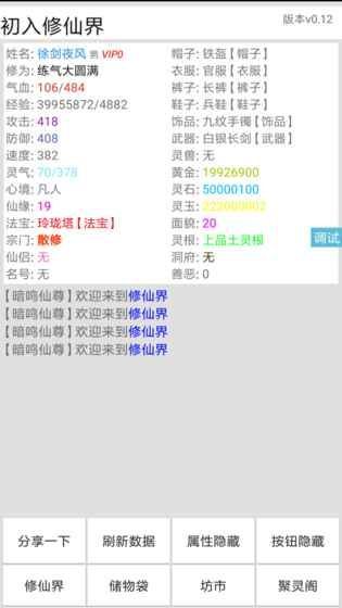 初入修仙界是一款全新风格的文字修仙养成类手机游戏,玩家们可以在这里体验到完全不同的修仙方式,玩家在这里能够更加清晰的查看到具体数据的变化,让自己的心中有点底,根据小说改编,和小说不同的就是成长全靠玩家自己,越努力,也将会变得越强大,如果你也感兴趣的话就来下载体验一下吧。