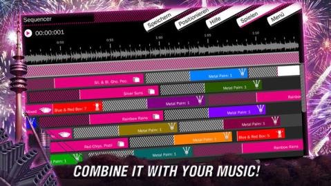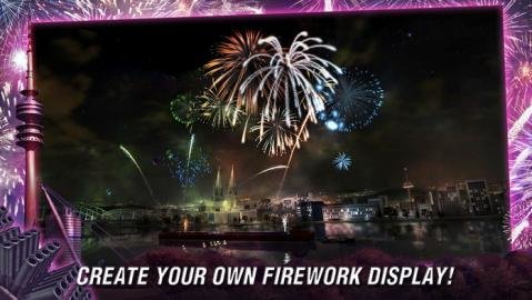 在游戏中,玩家可以设置各种烟花类型,地面类型和空中类型,空中类型分为几个高度距离,以及烟花数量、引线类型等设置条件。设置完类型后,玩家需要设置烟花场景,包括德国的莱茵河和慕尼黑的奥林匹亚公园。然后选择背景音乐,玩家可以选择默认的游戏音乐或自己的音乐。然后,玩家设置“定序器”,为不同的烟花分配不同的时间和音乐。最后,玩家点击镜头模式来安排烟花的展示。