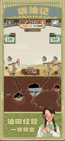 吸油记是一款非常有趣的模拟商业手游。游戏的画面设计精致,画风非常卡通。通过开采石油成为石油大亨是非常有趣的,各种有趣的道具可以帮助玩家更好地完成任务并自由体验。来玩吧。