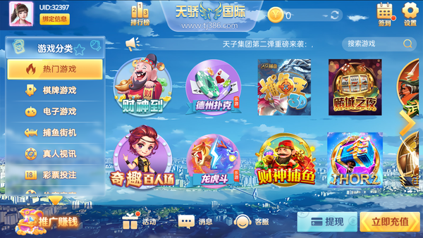 无需注册就能一键登录的手机棋牌游戏平台【天骄国际棋牌】,天骄国际棋牌中包含了经典、热门的棋牌游戏种类,首次登录会有丰厚的游戏红包、福利,独特的排行榜,可以查看排名,喜欢的小伙伴们赶快来下载天骄国际棋牌体验吧。