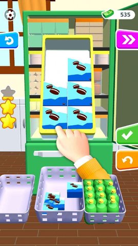 开心翻不停游戏是款简单的冰箱分拣游戏。冰箱里有各种各样的东西。一开始被乱放在冰箱里。需要把它们都翻出来放进篮子里,再把这些东西从篮子里放回架子上,使它们在冰箱里的排列整齐。